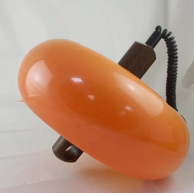 Lot 141 of 787: A c1970s orange plastic and oak retractable ceiling light, the shade of cheese wheel form is mounted on an oak column with two bulb fitments attached, a coiled flex terminates at the ceiling mount, unmarked, possibly Scandinavian, diameter 42cm.
