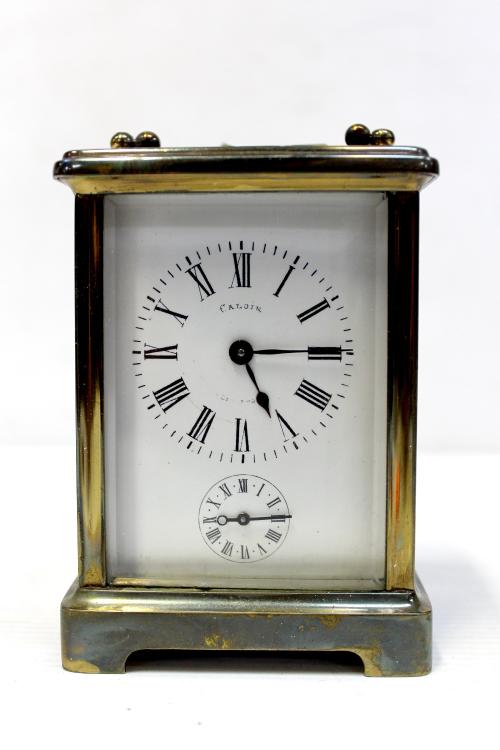 Lot 143 of 787: A French brass-cased carriage clock by Caloin, the enamelled dial set with Roman numerals and subsidiary dial, with swing handle and raised on bracket feet, height 11cm.