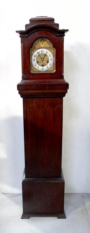 Lot 149 of 787: A 19th century mahogany granddaughter clock, the architectural cased clock top with stepped pediment, the brass dial with silvered chapter ring set with Arabic numerals, 'Junghans' triple train driven Westminster chime movement, height 135cm.