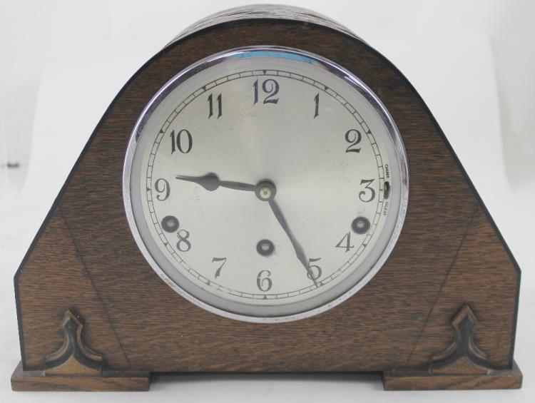 Lot 154 of 787: An early 20th century oak-cased mantel clock with silvered dial, height 22cm and a modern brass-cased quartz mantel clock (2).