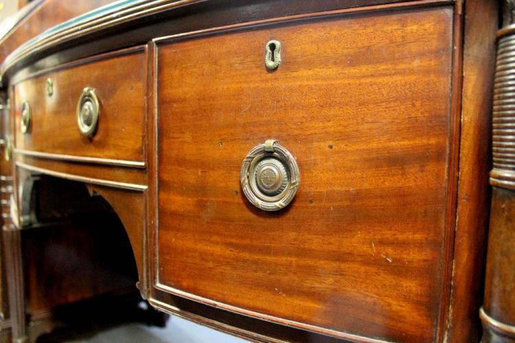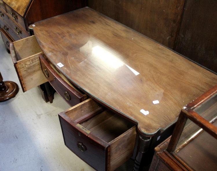 Lot 17 of 1057: A 19th century mahogany bow-front sideboard, the top shaped with corner lugs and fitted glass top, central drawer flanked by two deep drawers, brass ring handles, on turned tapered column supports, length 116cm, height 76cm.