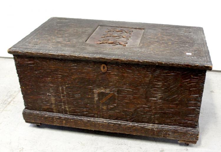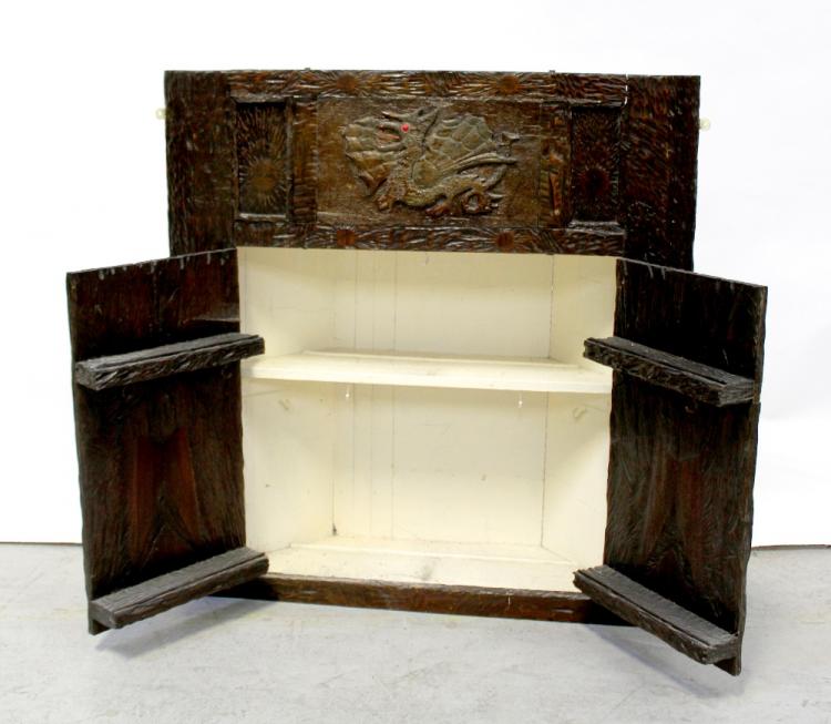 Lot 25 of 1057: A mid-20th century locally hand-carved wooden chest of drawers, two short and two long, height 78cm, with a matching cupboard, height 78cm, blanket box, width 97cm and wall-hanging corner cupboard, height 87cm, width 84cm (4).