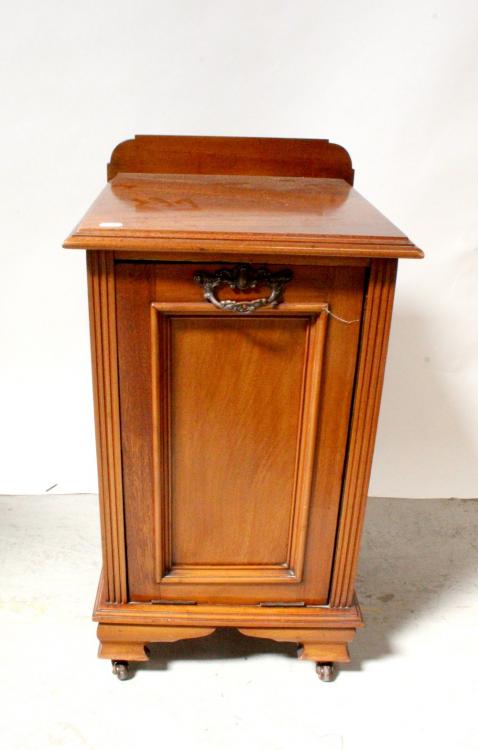 Lot 60 of 1057: An Edwardian mahogany coal purdonium with fall front and raised on bracket feet to castors, with original metal liner, width 40cm, height 76cm.