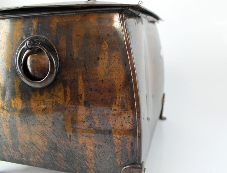 Lot 65 of 1057: An Arts & Crafts style copper finish coal scuttle raised on four supports with blue hardstone cabochon to front, 28 x 33 x 27cm (af).