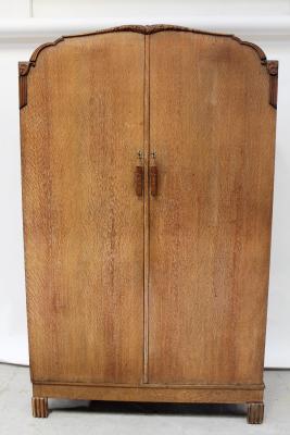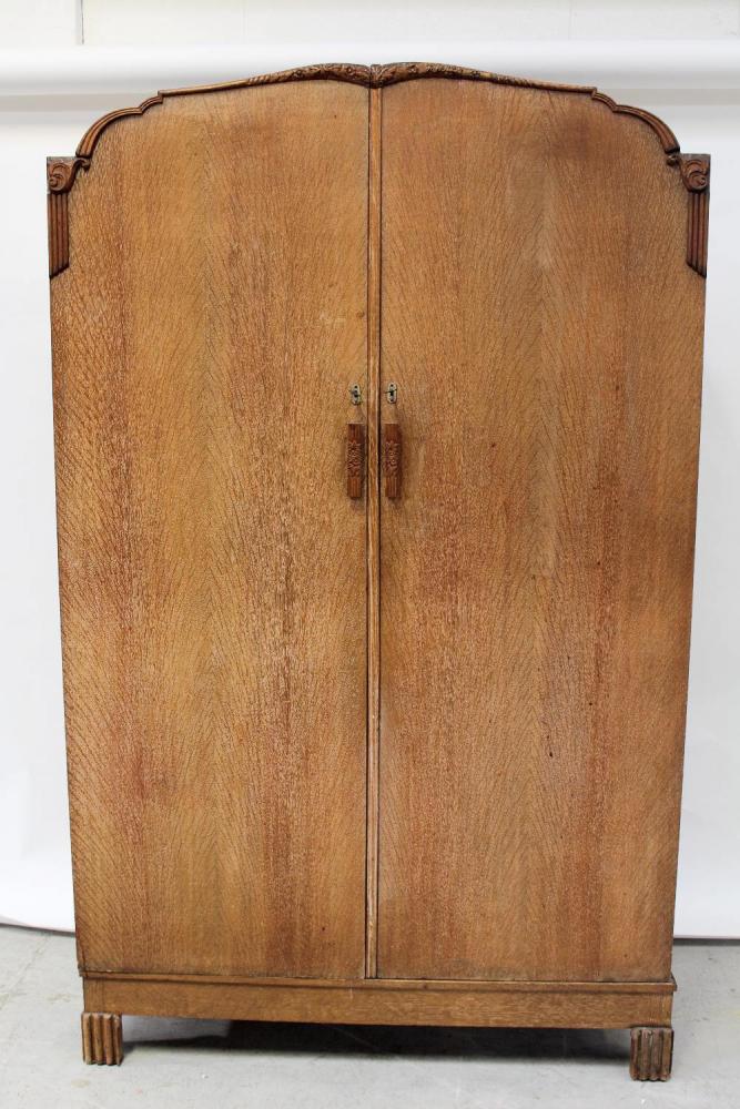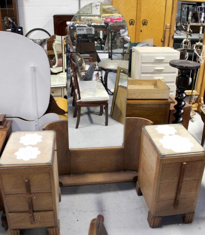 Lot 82 of 1057: An Art Deco oak three-piece bedroom suite comprising wardrobe, tallboy with two drawers over a cupboard and a dressing table with full-length mirror and pair of cupboards carved with floral motifs (3).