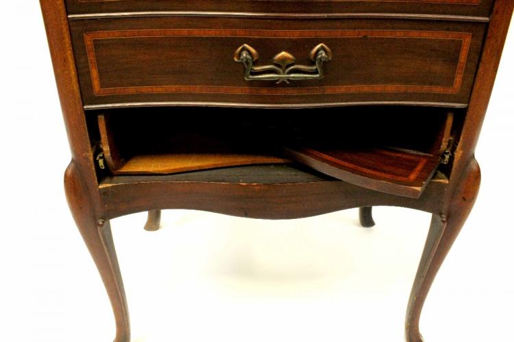 Lot 6 of 843: An Edwardian mahogany and satinwood inlaid serpentine-fronted music cabinet with shaped galleried tray above open shelf and five fall-front drawers and raised on cabriole legs, width 56cm, depth 42cm, height 98cm (af).