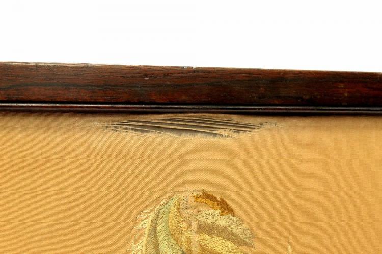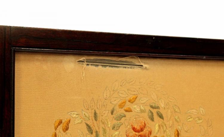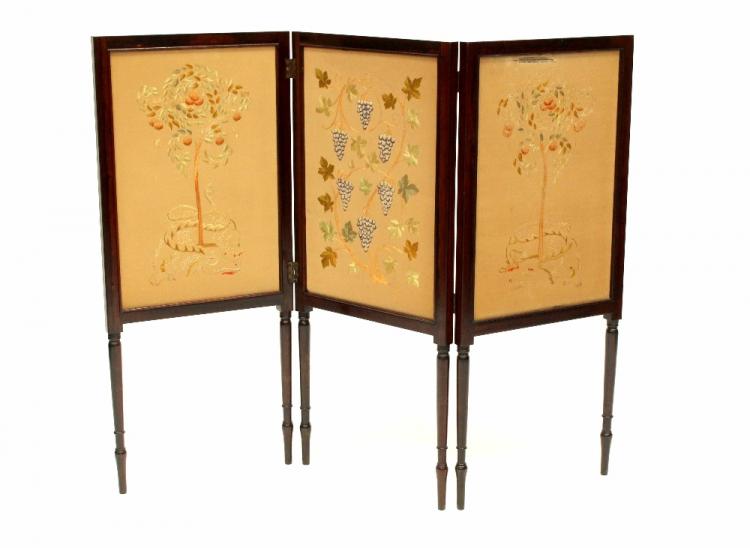 Lot 8 of 843: An Edwardian rosewood three-fold screen inlaid with needlework panels depicting flora and fauna, on turned tapering legs, width 119cm.