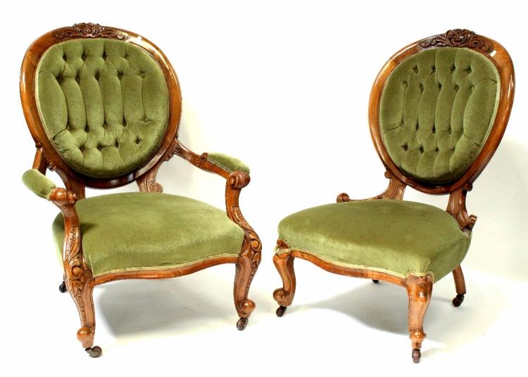 Lot 24 of 843: A Victorian walnut three-piece suite comprising three-seater settee, an open-arm fireside chair and matching fireside chair, pierced scroll and foliate decoration, upholstered in green button-back velvet, on cabriole legs, width approx 80cm (3).
