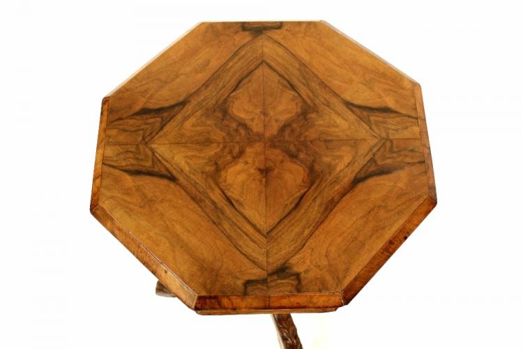 Lot 35 of 803: A Victorian walnut sewing table of trumpet form with octagonal top, on carved tripod base, fitted interior, width 45cm, height 74cm.