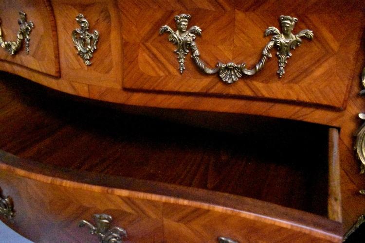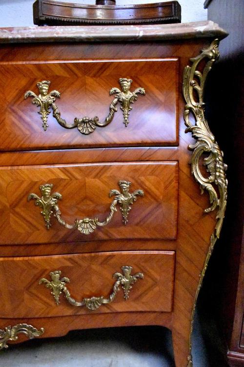 Lot 63 of 803: A French-style reproduction bombe commode of two short over two long drawers, banded mahogany and walnut veneer, foliate moulded gilt brass handles and gilt brass mounts, rouge marble top, width 116cm, height 87cm, depth 52cm.