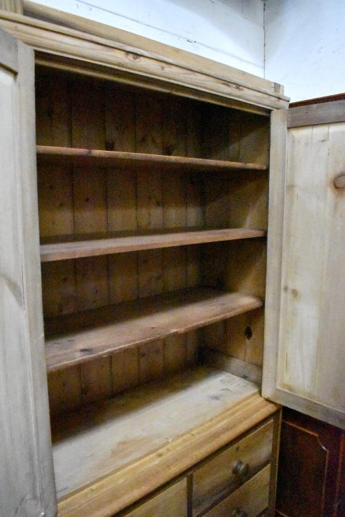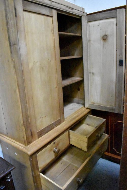 Lot 75 of 803: A pine linen press of small proportions with pair of panel doors enclosing three adjustable shelves above two short and two long drawers, to plinth base, width 106cm, height 195cm, depth 47cm.