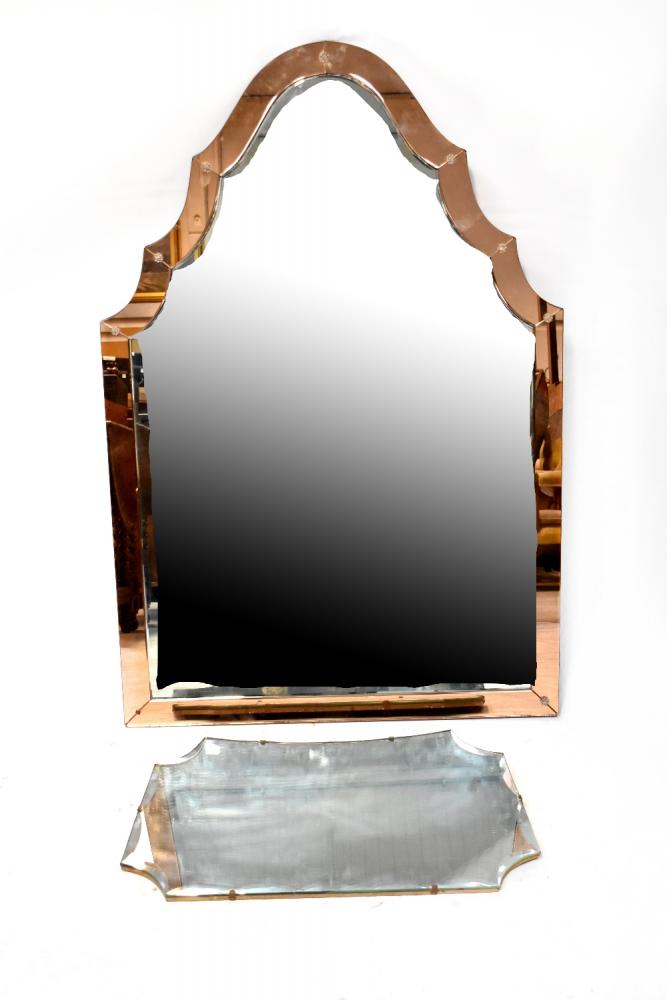 Lot 89 of 803: A retro wall mirror with peach glass frame and another smaller shaped example, the largest 82 x 123cm (2).