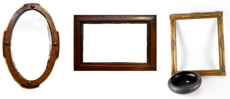 Lot 91 of 803: Two early/mid-20th century oak-framed mirrors, one rectangular bevel-edged example and an oval Arts & Crafts style example, the largest 60 x 70cm, also a gilded picture frame and an early 20th century Japanese black lacquer bowl with red decoration, diameter 30cm (4).