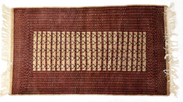 Lot 99 of 803: A red ground Eastern carpet with beige central panel surrounded by a stepped floral border, approx 162 x 90cm.