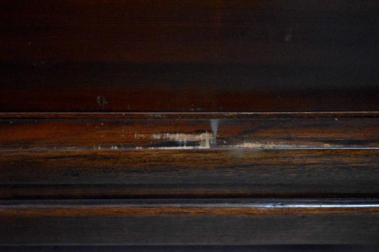 Lot 38 of 983: An early/mid-20th century Chinese oak and hardwood cabinet with fitted interior, three small drawers with inset carved drawer pulls to one side, small compartment above three long drawers, with Art Deco inspired abstract inlaid doors to carved supports, 115 x 94cm.
