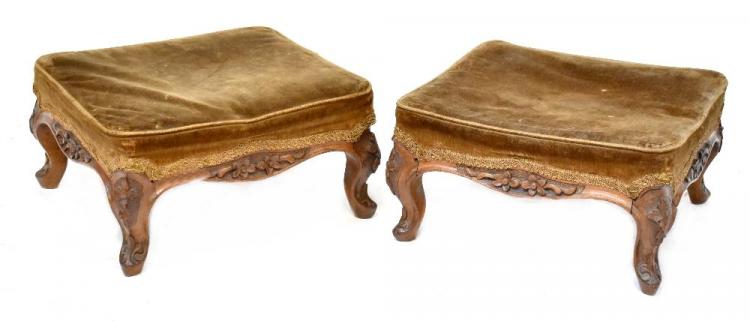 Lot 77 of 983: A Victorian walnut nursing chair with acanthus carved surmount, on cabriole legs, upholstered in brown tapestry, height 100cm and two walnut footstools (3).