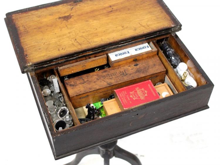Lot 90 of 983: A Victorian inlaid mahogany square-topped games table, the top with chess board within borders, the hinged top revealing a fitted interior, on a turned column and quadripartite base, width 46cm.