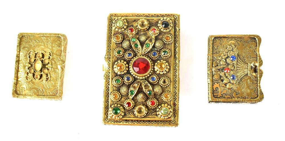 Lot 228 of 983: Three various decorative match cases/snuff boxes to include two gem-set examples, length of largest 7.5cm (3).