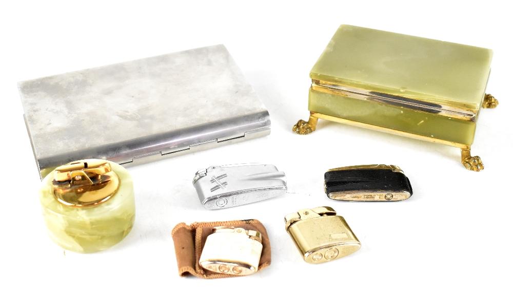 Lot 230 of 983: A vintage onyx cigarette box and matching table lighter, a Gense of Sweden stainless cigarette box in the form of a book, also four Ronson pocket lighters to include gold plated, mother of pearl clad, aluminium and a leather clad example (7).