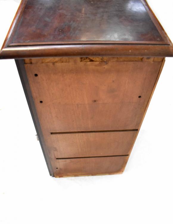 Lot 35 of 984: A mahogany bedside table with interior of three fitted drawers and shelves (converted from a pedestal desk), height 63.5cm, width 42cm.