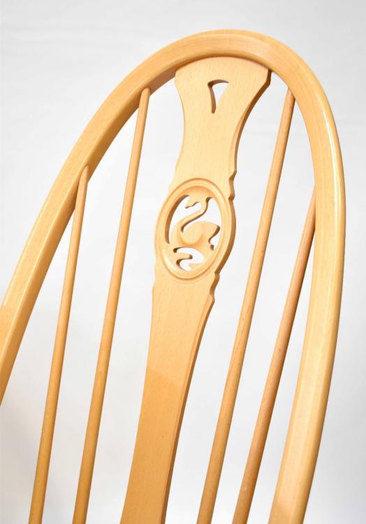 Lot 10 of 713: An Ercol circular pale elm dining table on baluster pedestal and quadripartite support, diameter 102cm and a set of four matching swan-back Quaker-style chairs to include two carvers and a matching dresser, twin glazed doors top the top over two small cupboard doors, over two frieze drawers and panelled doors to a plinth base, design no.588L, height 196cm, width 99cm (6).
