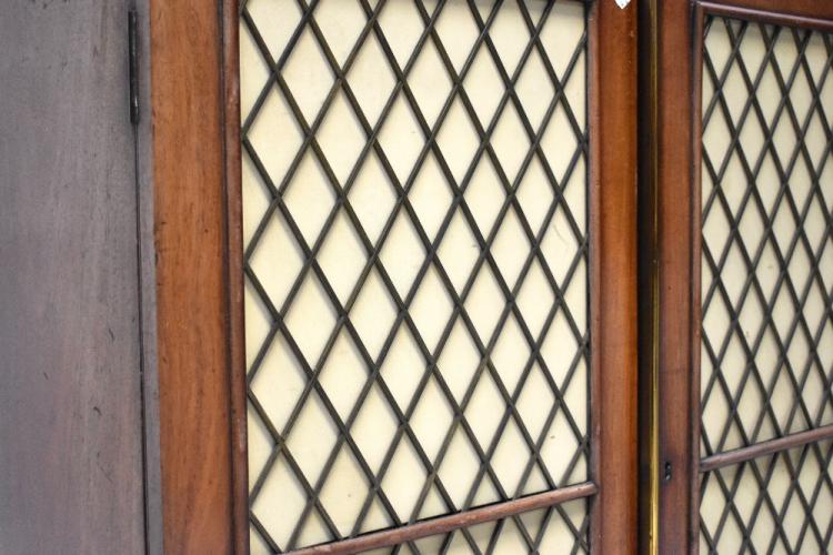 Lot 12 of 713: A pair of Regency mahogany glazed bookcases, each with a lancet top above pair of glazed doors enclosing six shelves, on a cupboard base, each door fitted with a metal lattice work grille over a material-line panelled door on a plinth base, 255 x 84 x 36.5cm.