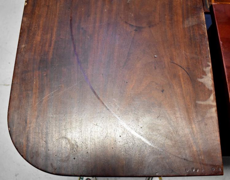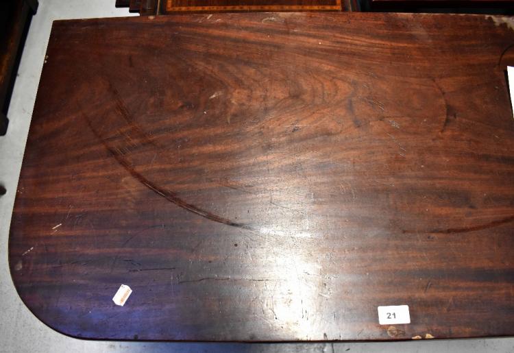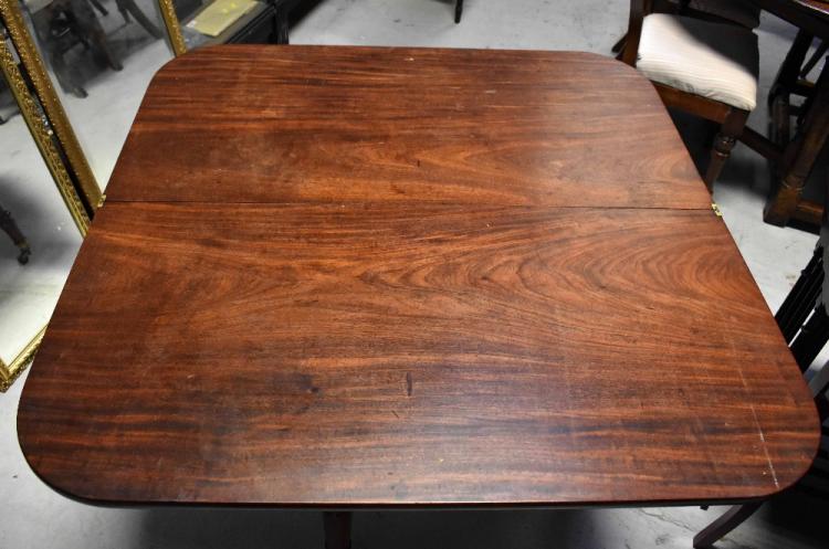 Lot 21 of 713: A William IV mahogany fold-over tea table supported on carved and turned tapering legs with brass castors, 75.5 x 98.5 x 49.5cm.