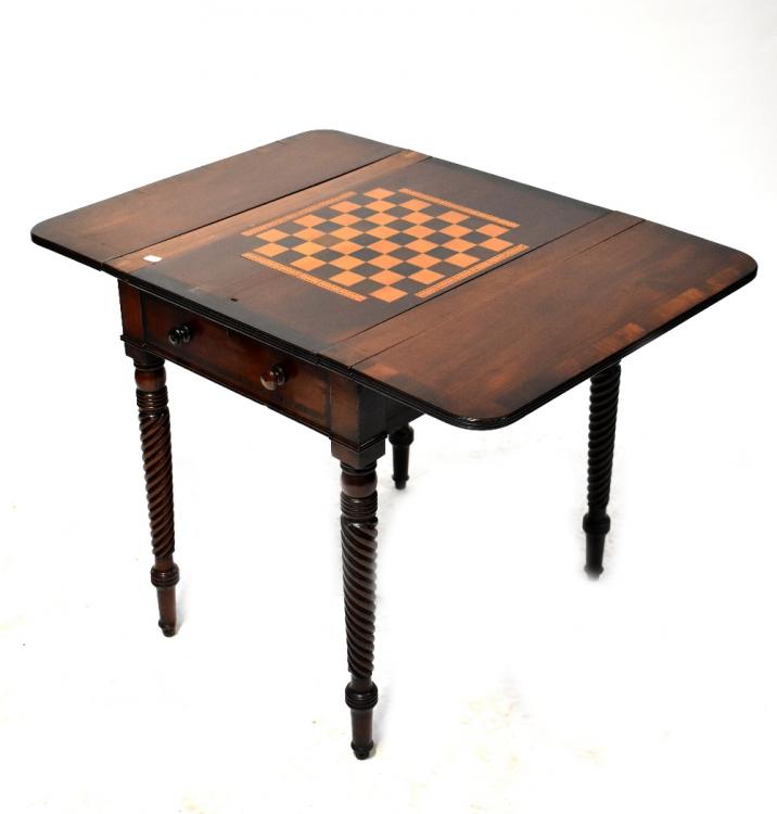 Lot 22 of 713: An early 19th century mahogany dropleaf games table with slide-out reversible top inlaid with chessboard and the base with backgammon board, dummy drawer to frieze, supported on wrythen turned tapering legs, height 67cm, width 67cm, length when open 93cm.