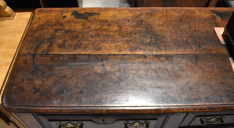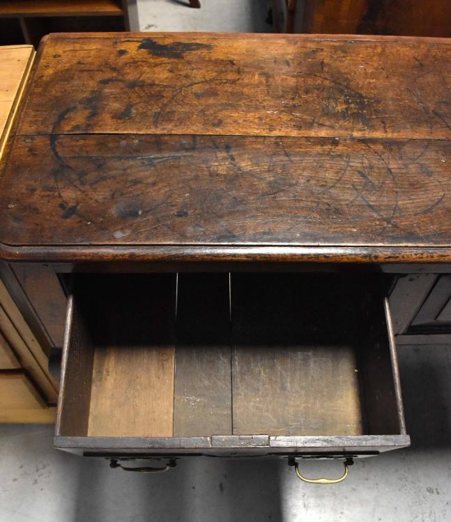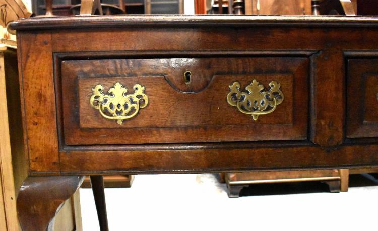 Lot 23 of 713: An 18th century oak dresser base of large proportions comprising four frieze drawers, each with pierced brass drop handles, on cabriole legs with pad feet, 79.5 x 221 x 51cm.