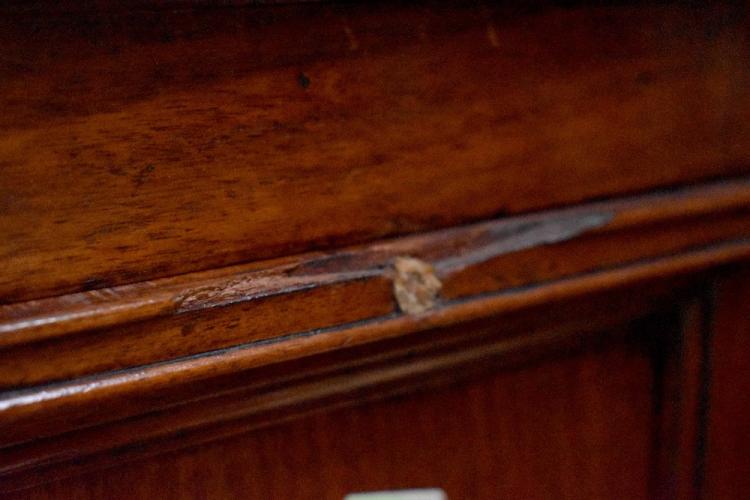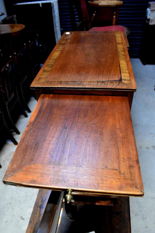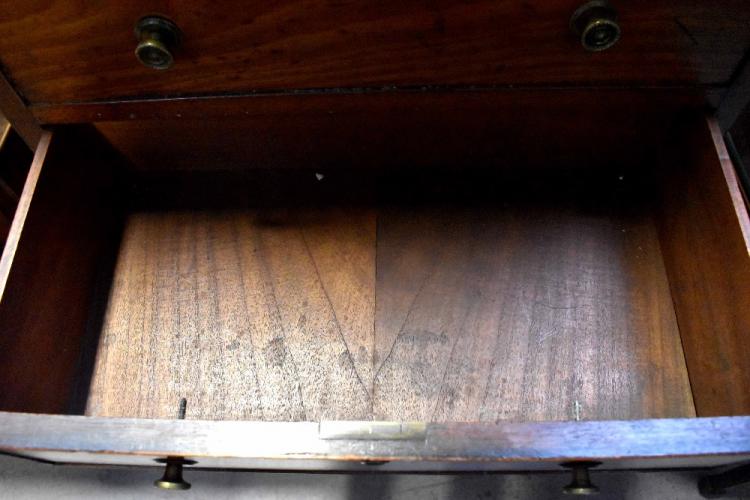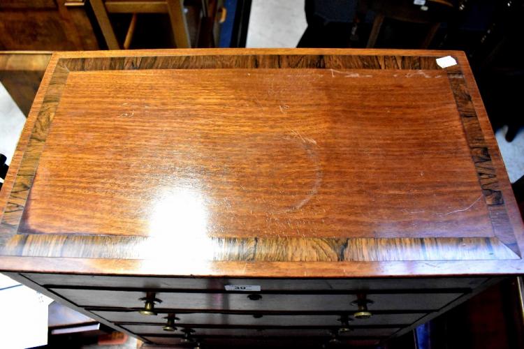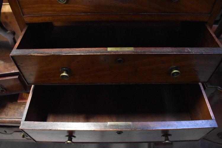 Lot 30 of 713: A good 19th century mahogany chest of small proportions, the top cross-banded with rosewood, the sides each with brushing slides above fielded and panelled sides and back, four long drawers with pressed brass handles and escutcheons, on reeded bun feet, 71 x 55 x 30cm.