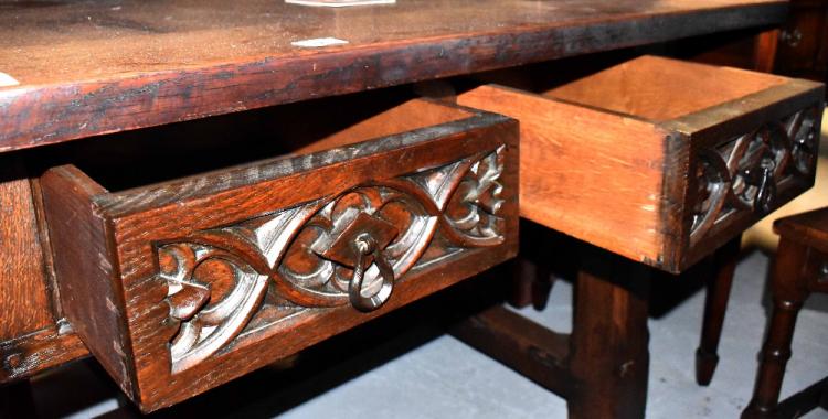 Lot 37 of 713: A large oak Gothic Revival refectory table with three drawers to each side with carved decoration and drop handles, on chamfered square legs united by an H-stretcher, 76 x 175 x 105.5cm.