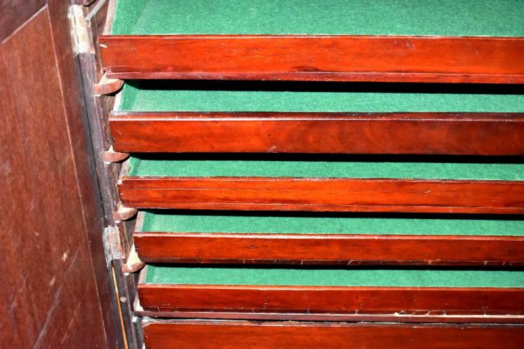 Lot 45 of 713: An Edwardian mahogany collector's cabinet, the interior fitted with five baize-lined slides and a large drawer, on square tapering legs, 129 x 101 x 61.5cm.