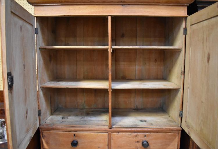 Lot 5 of 491: A Victorian pine linen press with broken swan neck pediment above pair of cupboard doors enclosing slides, above a base of two short and three long drawers, on bracket feet, 221 x 135 x 57cm.