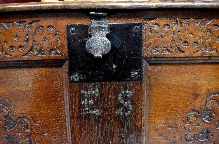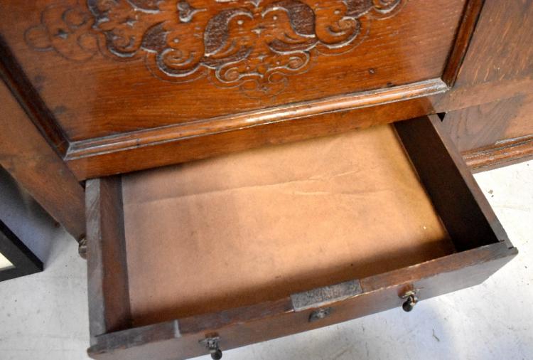 Lot 31 of 491: A Georgian carved oak mule chest with iron escutcheon, carved frieze and panels above two short drawers, on stile feet, 69 x 122 x 52.5cm.