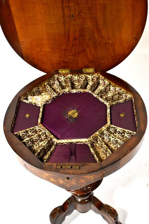 Lot 40 of 491: A Victorian inlaid walnut trumpet table with chessboard top and fitted interior for sewing, on a carved tripod base, 74 x 45cm.