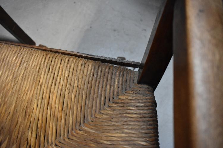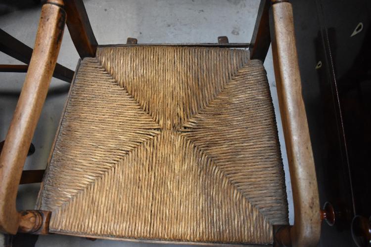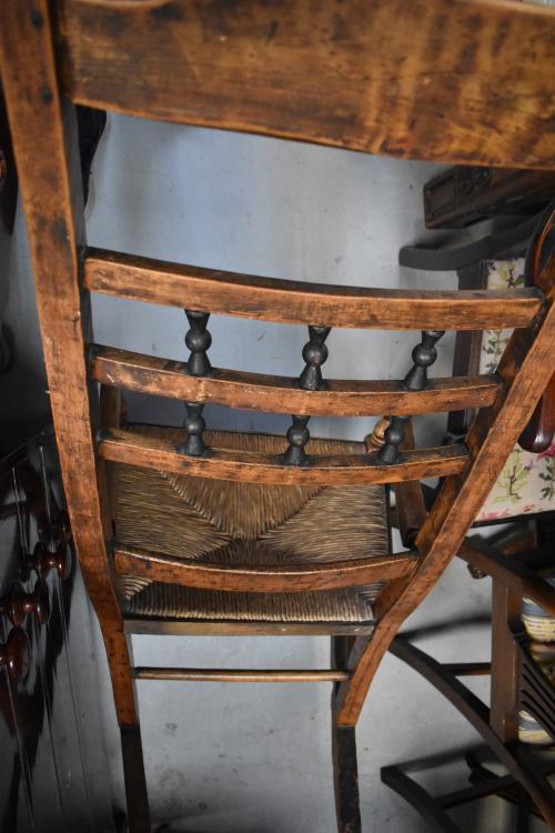 Lot 44 of 491: A 19th century country rocking chair, ladder back with turned decoration to outswept arms, ring turned supports and cross-stretcher, a reproduction drop-leaf occasional table, two small drawers, lyre sides and outswept supports to brass feet and castors, length when extended 84cm and an early 20th century stained pine toolbox with leather carrying handle (3).