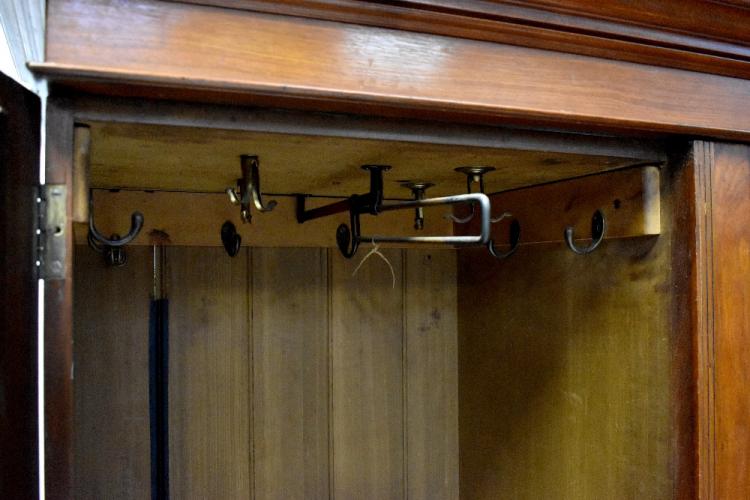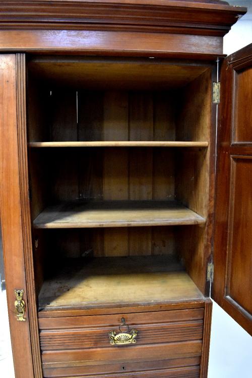 Lot 58 of 491: An Edwardian walnut compactum wardrobe with single mirrored drawer flanked by a carved and panelled door above three drawers, on a plinth base with single drawer, height 212cm.