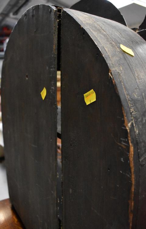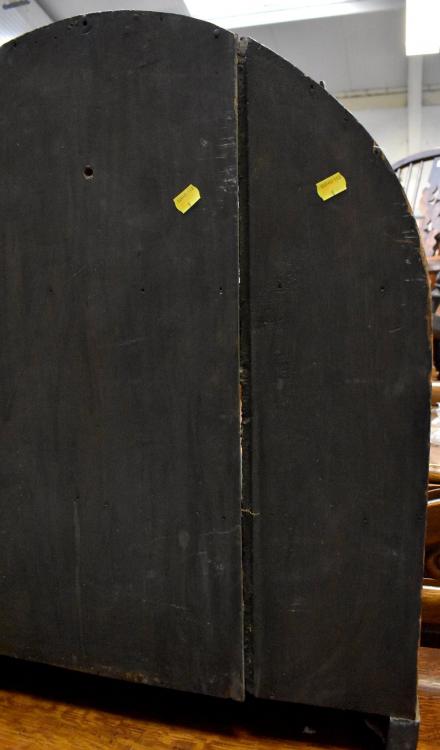 Lot 21 of 966: Antique oak shelves, the table top shelves with grape and flower carved dome top over three short shelves with shaped aprons on bracket feet, 80 x 63cm.