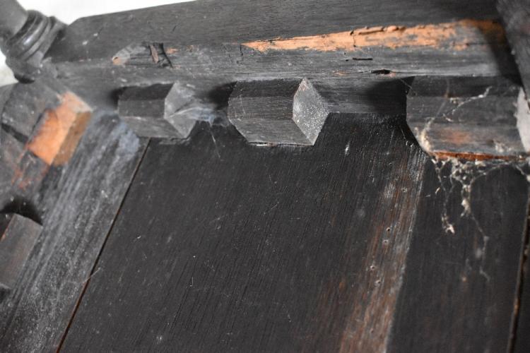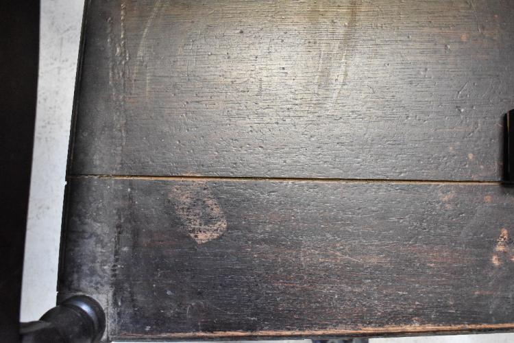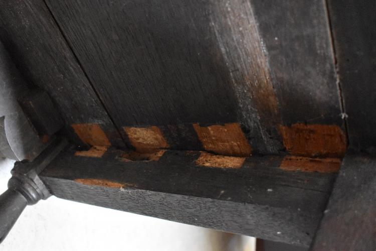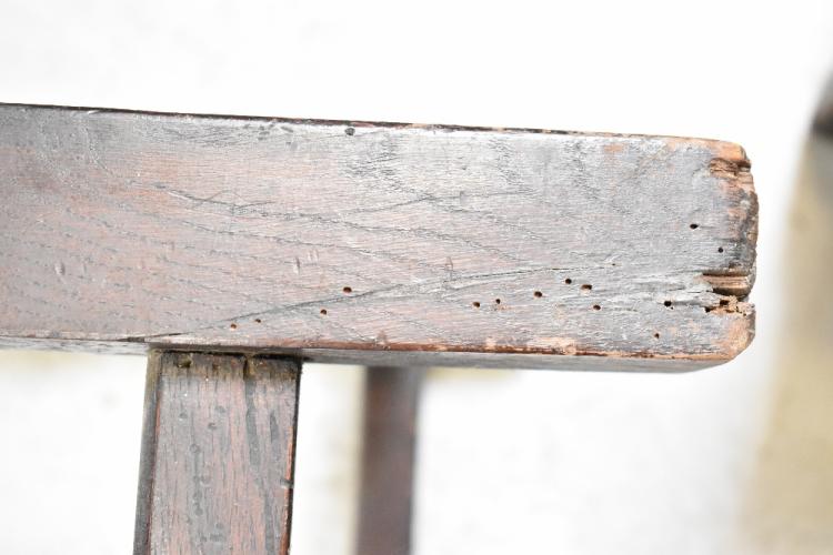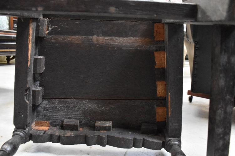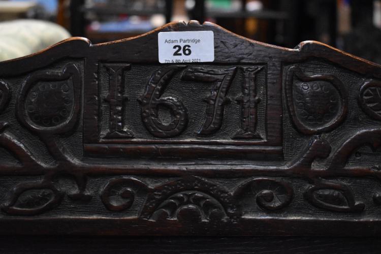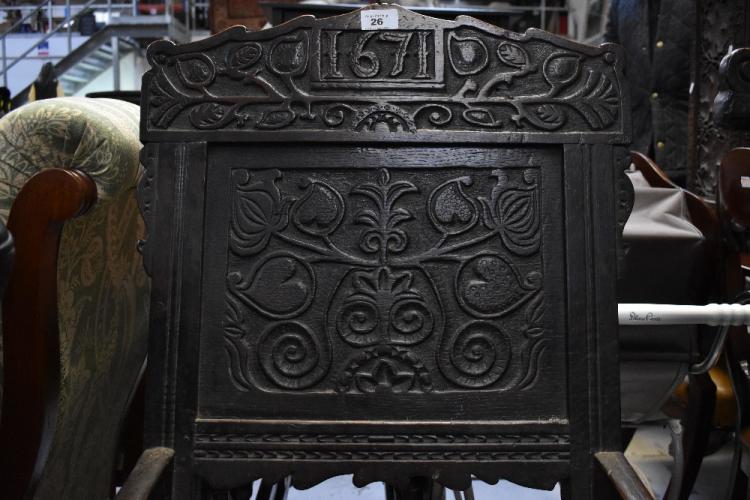 Lot 26 of 966: A 17th century carved oak Wainscot armchair, the shaped and carved top rail with a carved panel of 1671 above a carved back panel of flowing floral patterns, having a panel seat with scrolled elbow supports, raised on turned block legs united by stretchers.