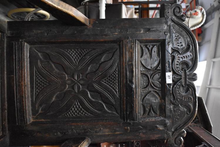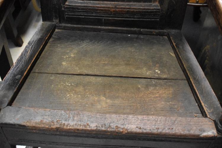 Lot 27 of 966: A 17th century carved oak Wainscot armchair, the shaped and carved top rail above two carved back panels of traditional patterns, having a panel seat with scrolled elbow supports, raised on turned block legs united by stretchers.