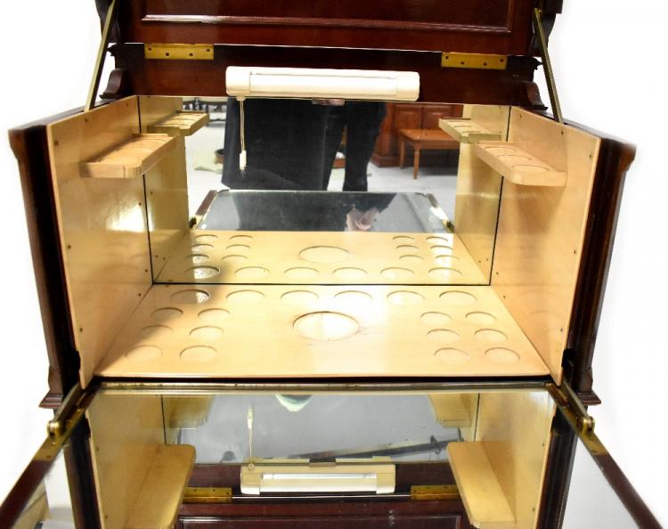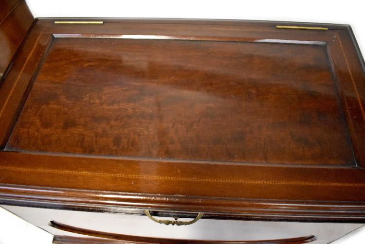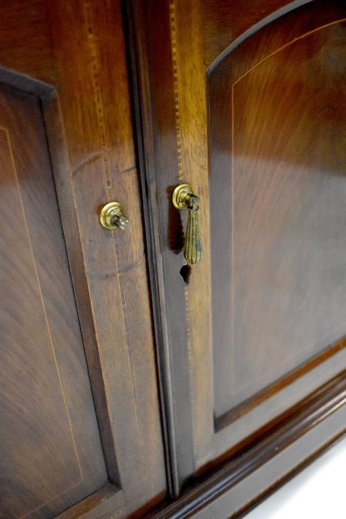 Lot 45 of 966: An Edwardian-style inlaid cocktail cabinet with cantilever mechanism opening to reveal a mirrored interior with fitted slots for glasses and decanters, above a pair of panelled doors and raised on stile feet, height 126cm, width 75cm, depth 44cm.