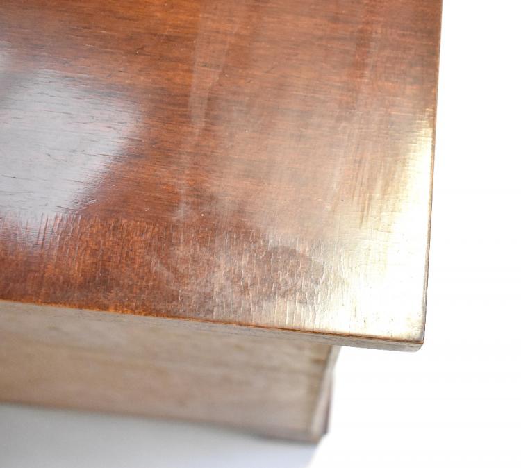 Lot 65 of 966: A Reprodux reproduction mahogany veneered crossbanded chest of drawers with central drawer flanked by two short drawers above two banks of three and raised on bracket feet, canted front corners, height 76cm, length 153cm, depth 50cm.