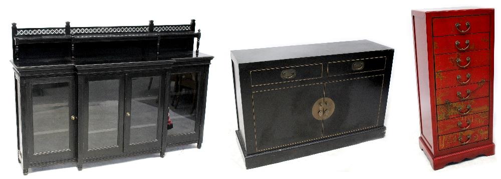 Lot 80 of 966: A contemporary black lacquer Oriental-style break-front sideboard/display cabinet, galleried shelf on turned supports above two central glazed doors to either side on block supports, 122 x 182cm, an Oriental-style black lacquer cabinet, two frieze drawers above two cupboard doors, with overall Oriental brass fittings to a plinth base, 77 x 115cm and an Oriental red lacquer eight-drawer slender cabinet with figural and warrior decoration to the top, on shaped plinth base, 95 x 43cm (3).