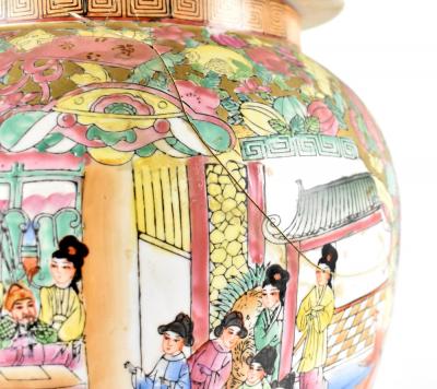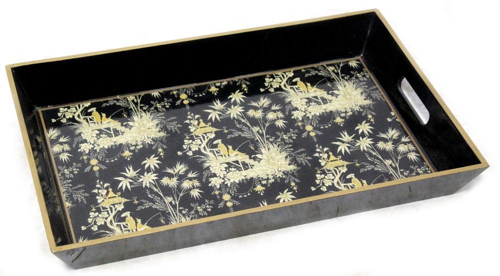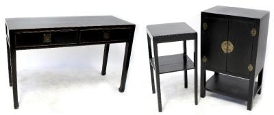 Lot 81 of 966: A contemporary Oriental-style black lacquered side table, two frieze drawers with brass handles, to block supports, 90 x 138cm, a similar Oriental-style black twin door cabinet with brass furniture, to block supports and lower shelf, 82 x 50cm, a black lacquer butler's tray with Chinoiserie decoration, a black decorated two-tier side table, 68 x 34cm, and a large Chinese Famille Rose palette baluster vase and cover with overall figural, floral and bird decoration, cover with gilded temple dog, h