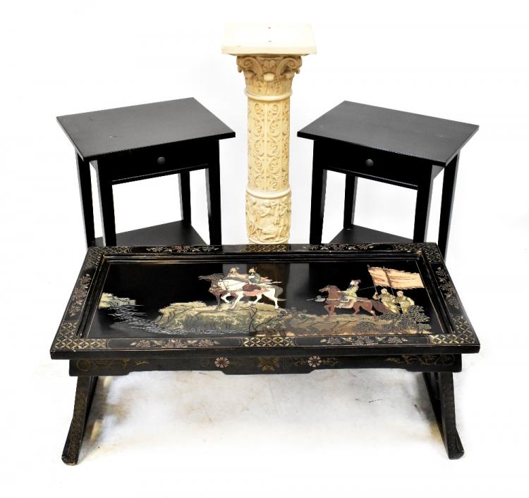 Lot 82 of 966: A contemporary black lacquer Oriental coffee table with central top panel of Japanese warriors within a carved and painted border, length 104 x 52cm (af), a pair of black stained side tables, 71 x 46cm, and an Indian-style composite jardinière stand with acanthus leaf decoration and central carved figural panel, to a square base, height 102cm (4).
