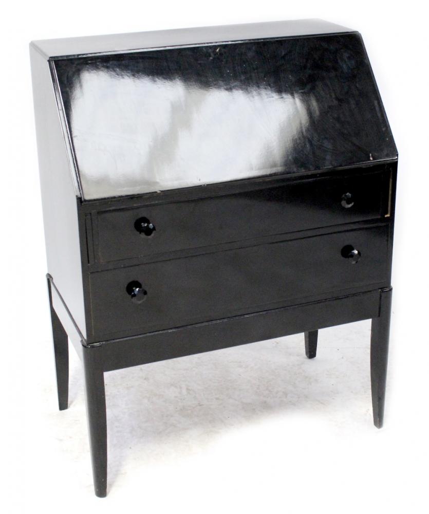 Lot 87 of 966: A contemporary Oriental-style black lacquer bureau, drop-down desktop with interior pigeonholes above two drawers to tapering block supports, 101 x 76cm.