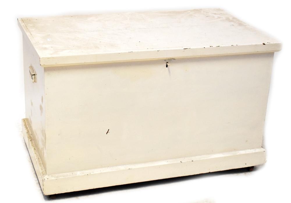 Lot 88 of 966: A large white painted pine blanket box with twin metal carry handles, on plinth base to castors, 65 x 105 x 60cm.