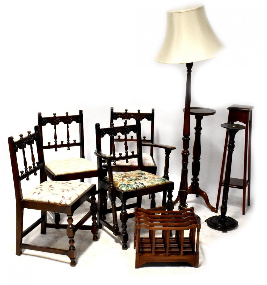 Lot 90 of 966: A set of four Ercol dark Gothic-style dining chairs (3+1), a modern standard lamp and shade, a four-section modern Canterbury, a mahogany plant stand, a mahogany jardinière stand with turned column on three splayed feet and a mahogany jardinière stand on faceted mahogany column and circular base (9).