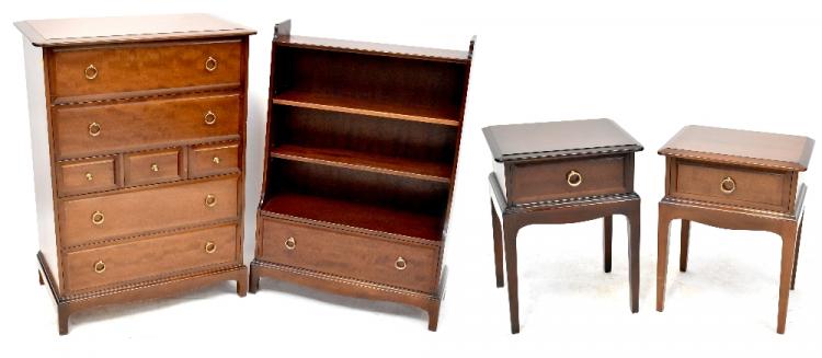 Lot 109 of 966: A pair of modern mahogany veneered bedside tables, each with single drawer, a chest of four bedroom drawers separated with three smaller drawers, on bracket feet, height 112cm, length 81cm, also a modern mahogany floor standing open bookcase over single drawer, on bracket feet, height 112cm, width 75cm (4).