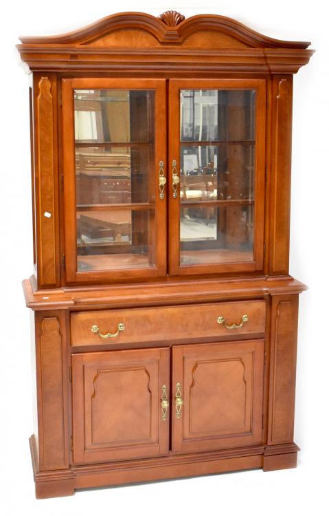 Lot 113 of 966: A modern break-front display cabinet with arched top above pair of glazed doors enclosing two shelves, above a single drawer and pair of panelled doors, raised on bracket feet, height 204cm, length 122cm, depth 41cm.